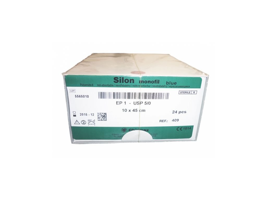 Nevstřebatelné monofilní polyamidové vlákno, modrá barva. Jehla trojúhelníková, poloměr 18.