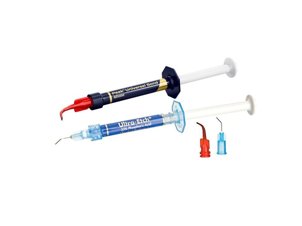 Peak Universal Bond Total-Etch Kit obsahuje: 1,2 ml Peak Universal Bond, 1,2 ml Ultra-Etch, 20 kanyl Blue Micro a 20 kanyl Inspiral Brush.